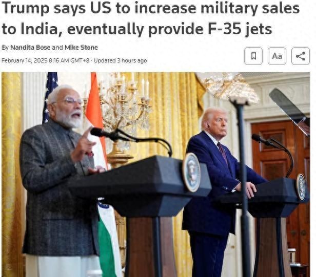 图片来源:路透社报道截图据报道,在与印度总理莫迪举行会谈后的联合记者会上,特朗普表示:“我们将大幅增加对印度的军售数额,增加的金额将达到数十亿美元。我们还在为最终向印度出售F-35隐形战斗机铺平道路。”特朗普未提供具体时间表,但像F-35隐形战斗机这种尖端技术的外销,通常需要数年时间才能完成。特朗普还透露,双方达成了一项协议,其中包括印度将进口更多美国的石油和天然气,以减少两国之间的贸易赤字。来源: 中国新闻网
